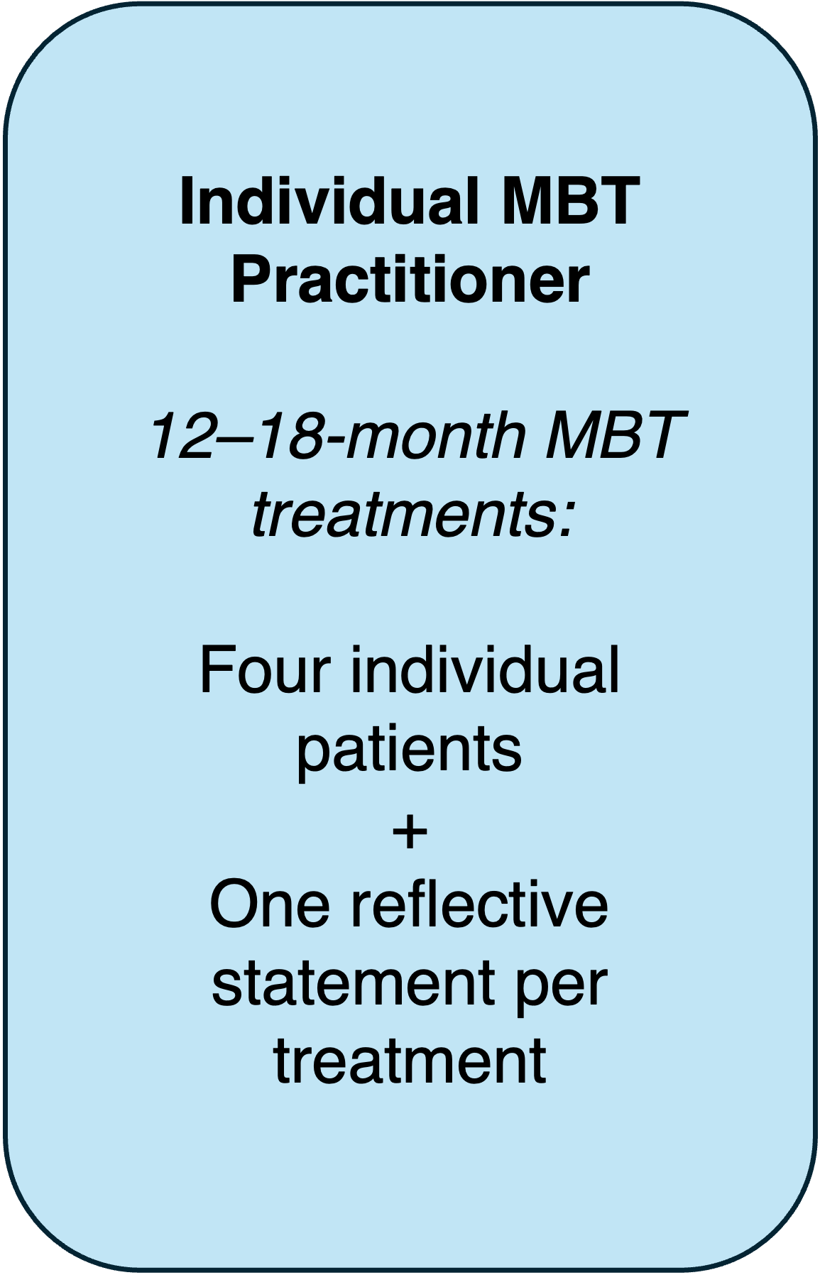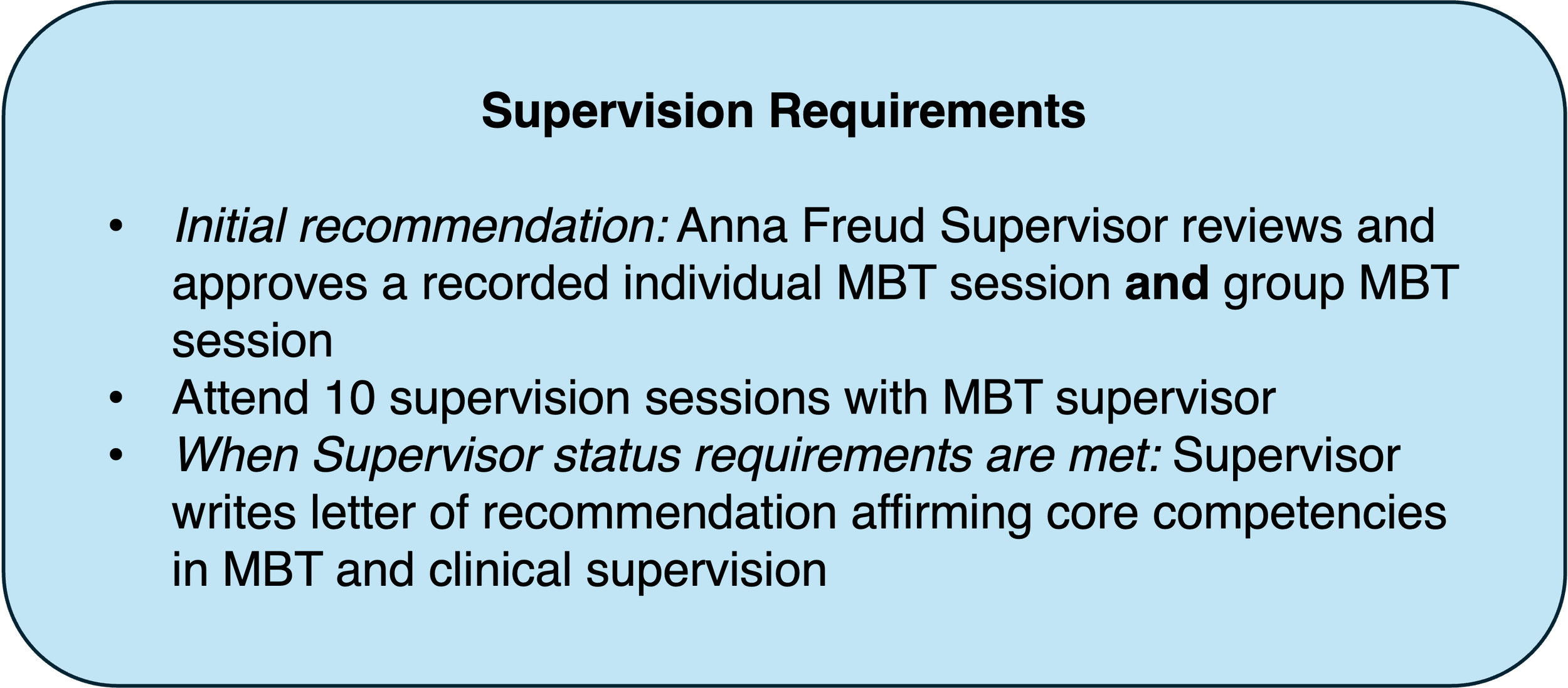 What if you are already a certified MBT Practitioner, and you want to learn how to supervise and train other clinicians in MBT? See below for the steps to become a certified MBT supervisor through Anna Freud in London. MBT supervisors are able to train other clinicians in the official or “adherent” version of MBT that is evidence-based in the treatment of borderline and antisocial personality disorders. Click HERE for the MBT Supervisor Status Pack, as outlined by Anna Freud in London.